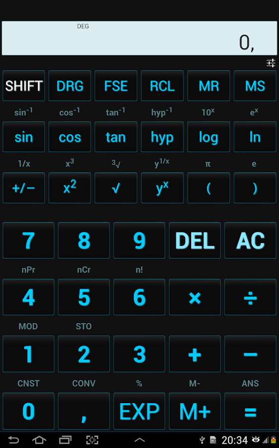 MyCalc includes: Scientific calculator, Standard calculator, Currency calculator, Tip and Percent calculator which can be accessed from the menu.