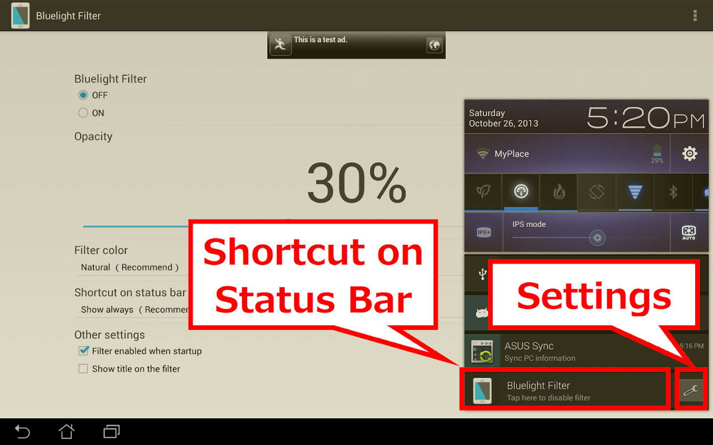 * When you install the app from the third party app store such as Amazon App Store, you can no longer press the Install button on the specification of Android when blue light filter is enabled. Then, tap this app in the notification area to disable the filter.