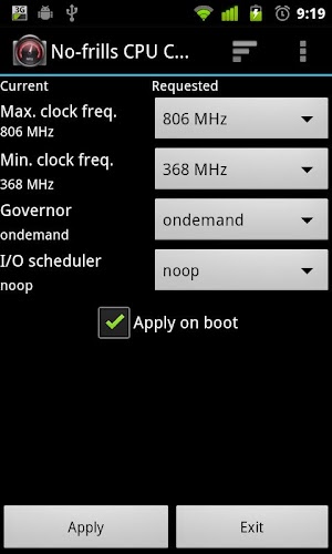 Be wary of the frequencies you select! Your phone may lock or become unresponsive if it doesn't like extreme values, but -hey- better safe than sorry: even though No-frills CPU Control allows you to choose if you want to apply the settings on boot, it comes with an extra "safety valve" too! If the device doesn't shut down (or reboot) in a clean way, it will not apply the settings, avoiding those nasty boot-loops you may have had with other overclocking apps. Please keep in mind that apps like QuickBoot are as quick as they are unsafe…