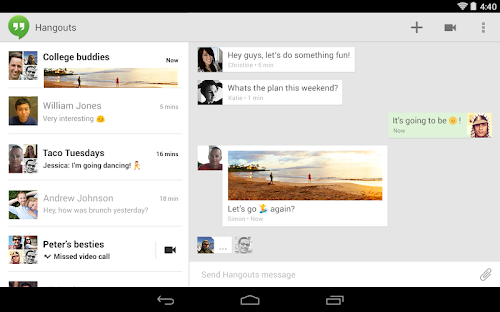: Google+ Hangouts is a messaging app that lets you send and receive messages, photos and videos, and even start free video calls one-on-one or with a group!