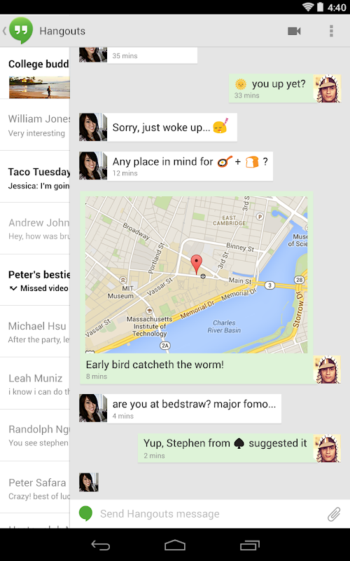 ● Send and receive both Hangouts and text messages (SMS/MMS) and easily switch between message types.