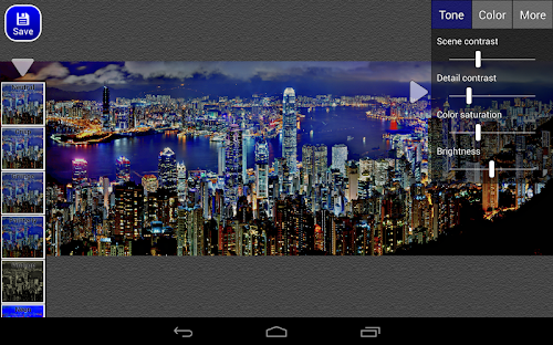 After you have found contrast settings you like, the rest is fine tuning. Adjust saturation and brightness to your liking. You can also adjust color balance and highlight/shadow definition. When you like what you see, click Save. After a moment of processing, you get a screen where you can share the saved picture with your friends or open it in another app like Android Gallery.